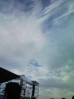 ステージセット(右側)と飛行機雲。17:20くらいなのでアジカンの待ち時間あたりかな。
